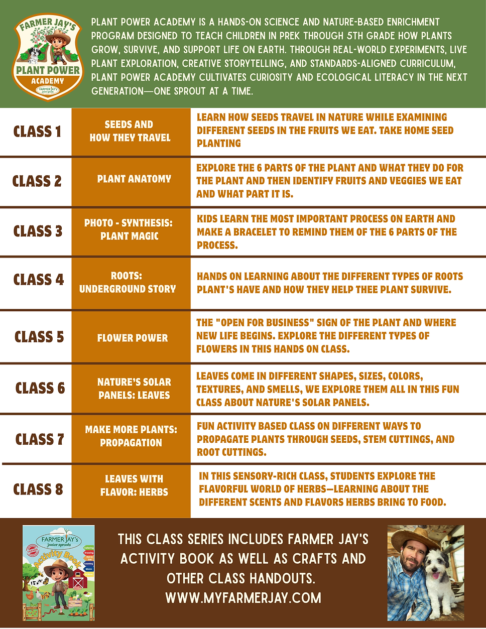 The Jr. Sprouts program is a series of eight classes designed to introduce PreK – 5th grade children to the lost art of sustainable agriculture. The program is designed to inspire children to inquire and learn more our food system & respecting nature. Each class has incorporated lectures with vocabulary, cool learning activities and fun books to make learning exciting. Below is the list of classes offered in this series. Classes are customizable and can be given individually or as a whole program. BOOK YOURS TODAY!!!!! For pricing and more info click